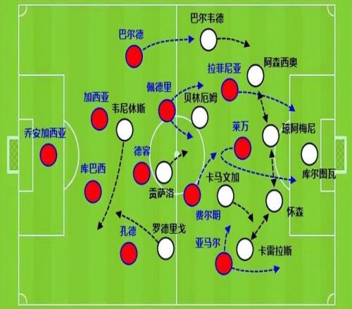 首先前锋回撤本身不是坏事,只是姆巴佩在接球前不愿意为队友做无球掩护跑,传球后也缺少及时的二次移动。相比之下,贡萨洛虽然跑动速度远远不如姆巴佩,不过他的跑动范围和习惯很好。回撤之后接球传球很迅速,同时也能二次跑位重新回到锋线顶端。